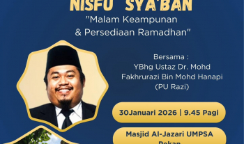 Kuliah istimewa ini telah disampaikan oleh YBhg Ustaz Dr. Mohd Fakhrurazi bin Mohd Hanapi (PU Razi) bersempena Festival Ramadan UMPSA 2026M/1447H, bertujuan menyemai penghayatan rohani serta mempersiapkan warga kampus dalam menyambut malam Nisfu Syaaban dan kedatangan bulan Ramadan.